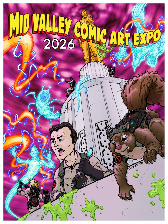 I was privileged to create a promotional piece for this year’s Mid Valley Comic Art Expo. The show’s mascot Max and a team of Ghostbusters battle ghosts at the Oregon capitol building.